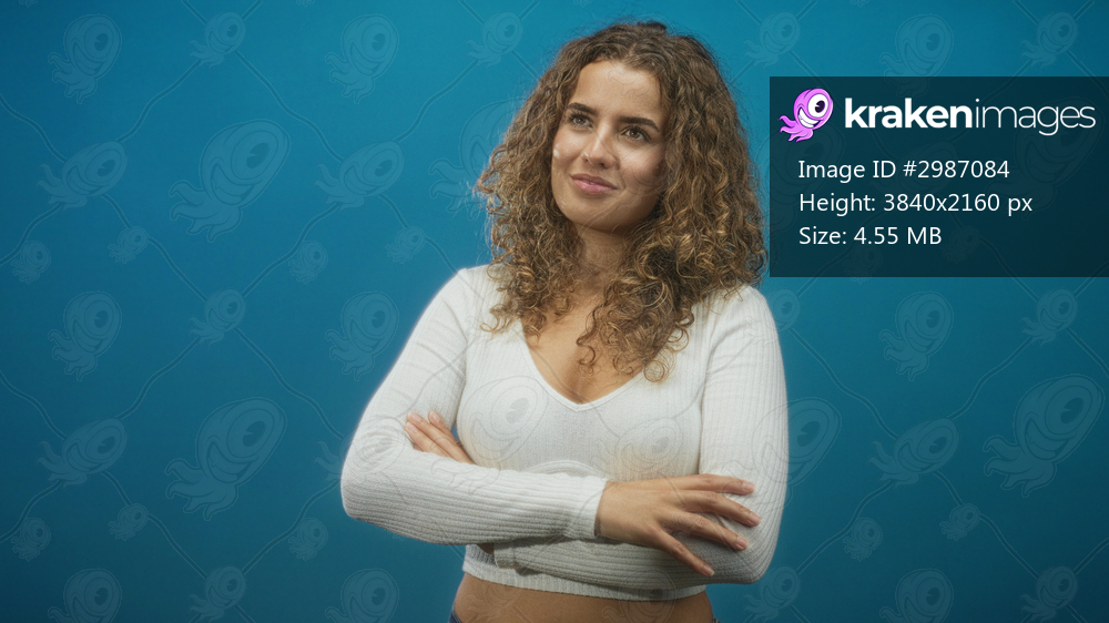 Woman with curly hair crossing arms, smiling, showing hands and v neck white sweater against a blue backdrop in a studio; confidence warmth.