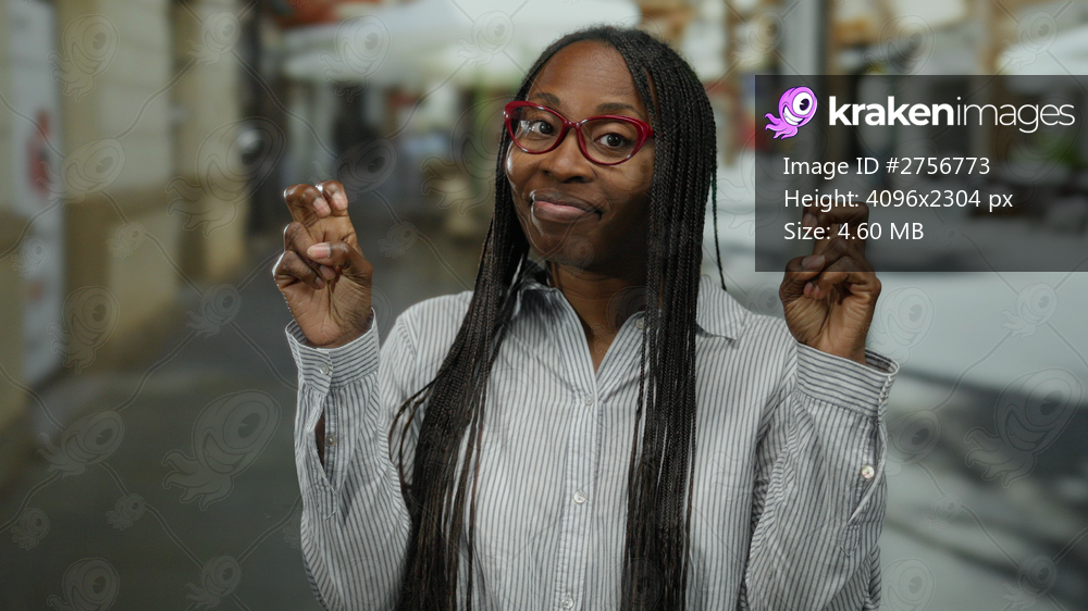 Woman with curly hair gestures with fingers outdoors on an urban street, wearing glasses, expressing emotion in a city environment during daytime.