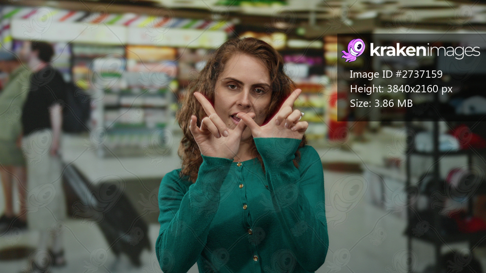 Woman with curly hair gestures and reacts expressively in a vibrant airport terminal setting, conveying emotions in an indoor travel environment.