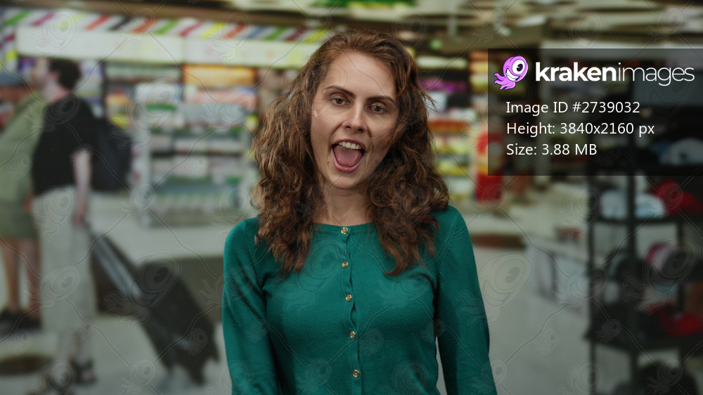 Woman with curly hair gestures and reacts expressively in a vibrant airport terminal setting, conveying emotions in an indoor travel environment.