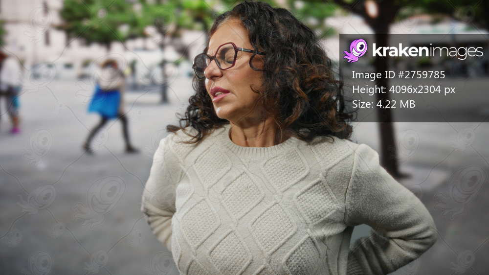 Woman with curly hair and glasses experiencing back pain outdoors in a city setting, emphasizing discomfort with an urban backdrop and mature expression. - Kraken Images
