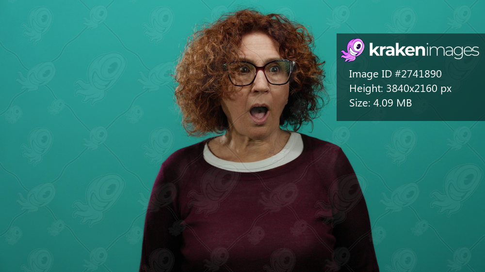 Woman with curly hair and glasses expressing surprise against a vibrant green background, evoking emotion with her open mouth while showcasing a casual, modern style. - Kraken Images
