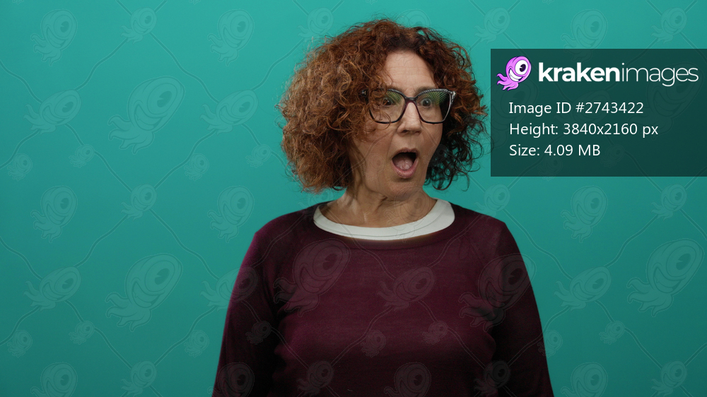 Woman with curly hair and glasses expressing surprise against a vibrant green background, evoking emotion with her open mouth while showcasing a casual, modern style. - Kraken Images