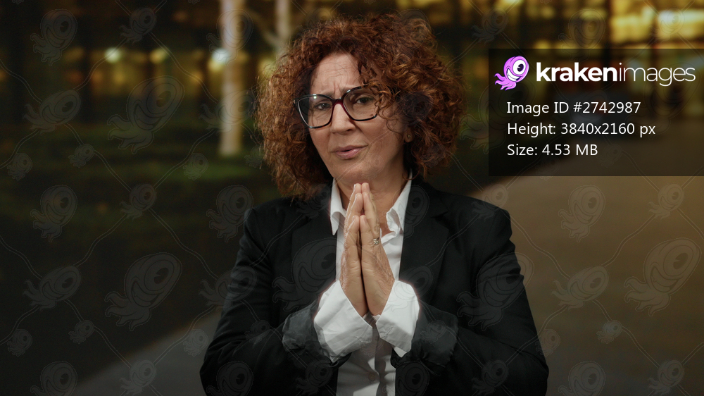 Woman with curly hair and glasses gestures outdoors on city street at night, expressing hope and sincerity with joined hands, lit by urban lights.