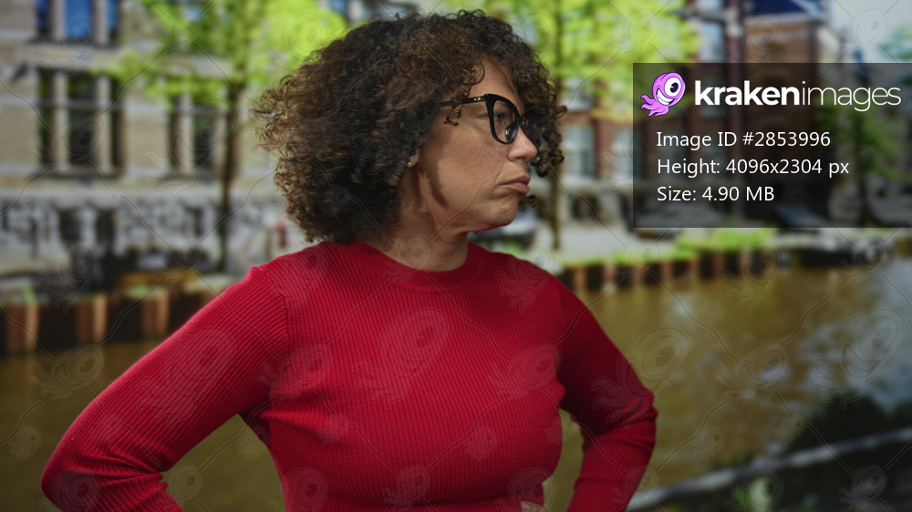 Woman with curly hair and glasses in red sweater finger pointing to canal on urban street in amsterdam; frustration.