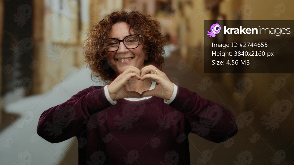 Woman with curly hair and glasses makes heart gesture while smiling on a city street background, expressing happiness and positivity outdoors.