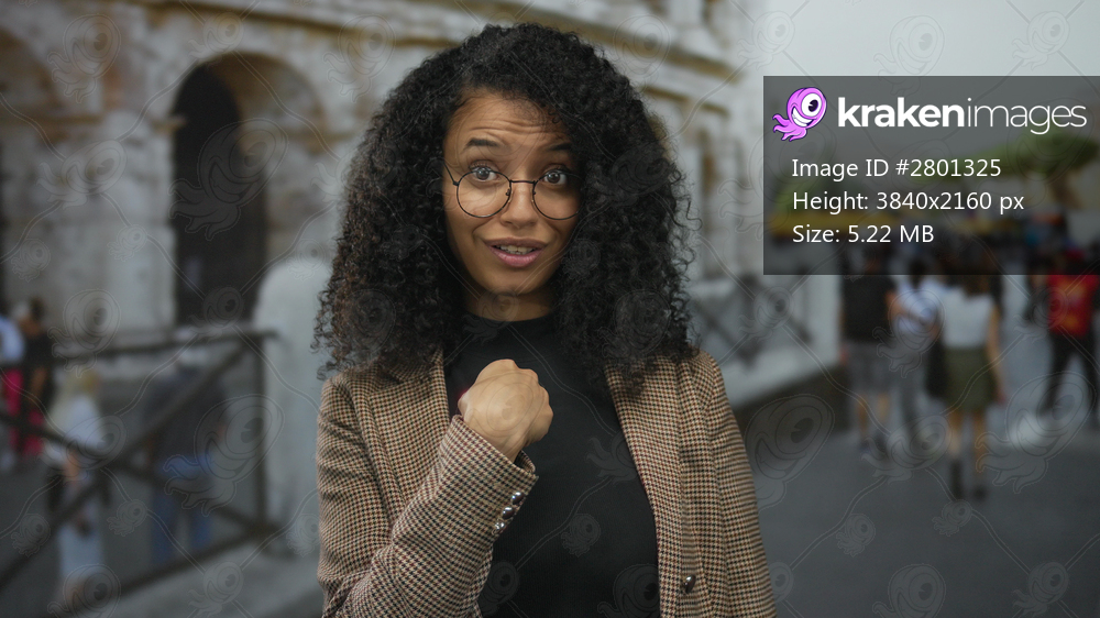 Woman with curly hair and glasses pointing finger to self on street in front of building facade; rejection.
