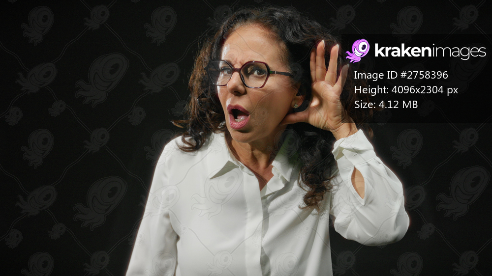 Woman with curly hair and glasses showing surprise on black background, wearing white shirt and expressing emotion through hand gesture while isolated in darkness. - Kraken Images