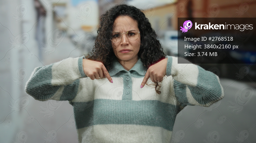 Woman with curly hair and glasses standing on an urban street wearing a striped sweater points confidently at herself in this outdoor cityscape setting. - Kraken Images