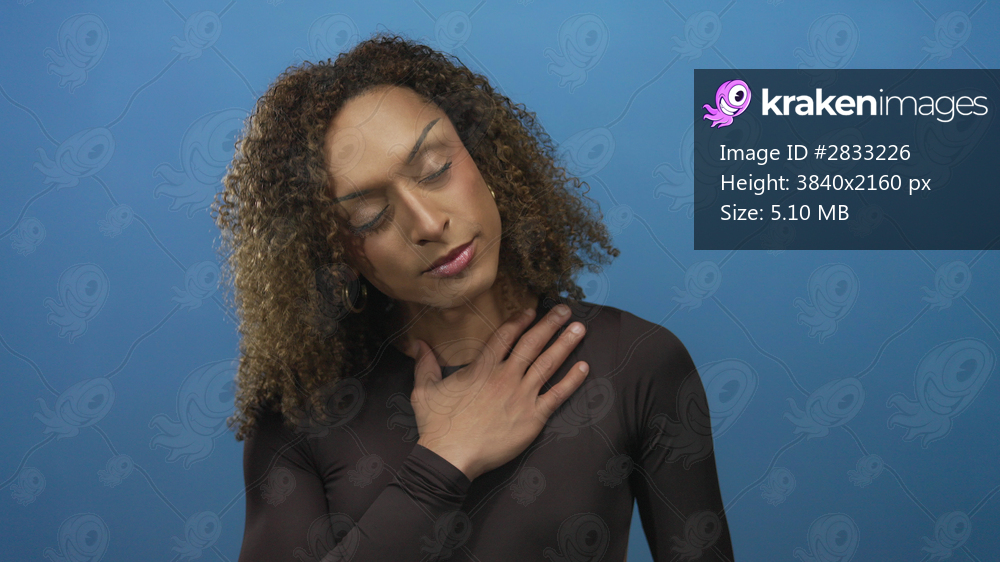 Woman with curly hair, gold hoop earrings and closed eyes clutching chest in blue studio space; serenity.