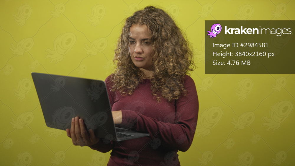 Woman with curly hair holding a laptop and typing with bare hands while standing against a solid yellow studio backdrop; concentration productivity workflow. - Kraken Images