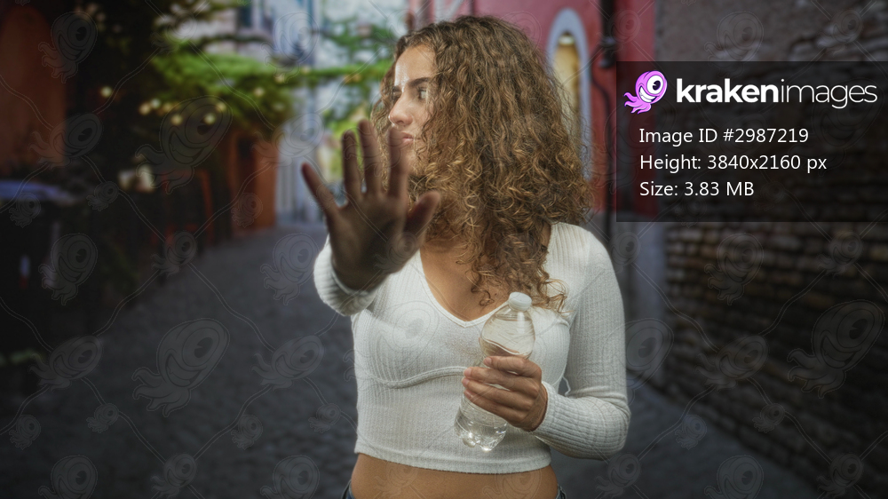 Woman with curly hair holding a water bottle, hand raised in stop gesture on a cobblestone street wearing a white ribbed sweater; defiance.