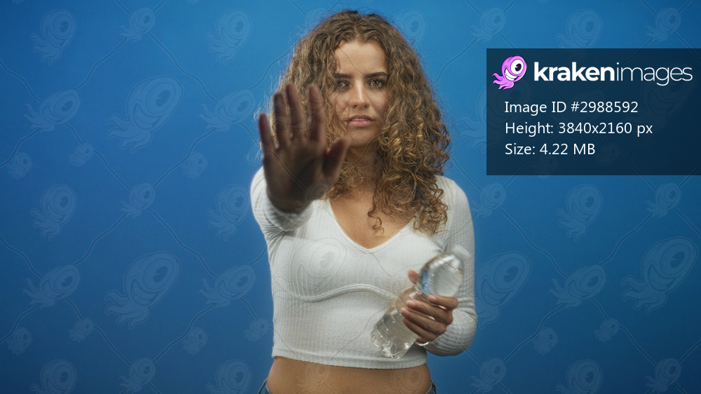 Woman with curly hair holding a water bottle, palm facing camera in stop gesture in studio; refusal.