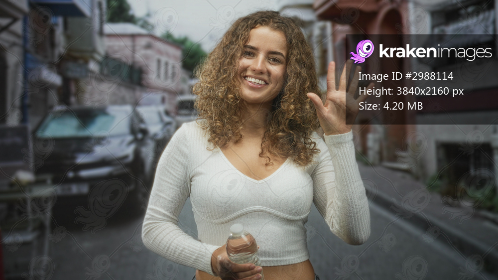 Woman with curly hair holding a water bottle, smiling and waving right hand on a narrow street beside parked cars and old buildings; joy.