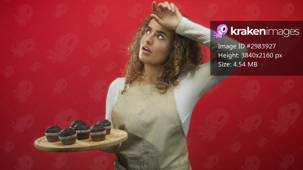 Woman with curly hair holding a wooden tray of chocolate muffins, arm lifted to forehead wiping brow gesture in studio with red backdrop and beige apron; quiet fatigue. - Kraken Images