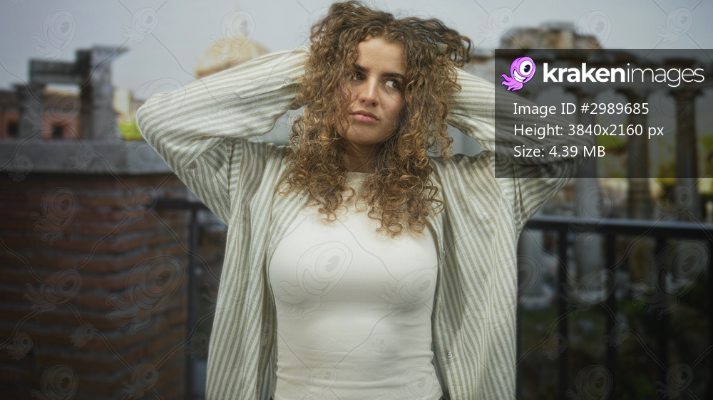 Woman with curly hair holding head with both hands, bare breast visible on rooftop building; quiet contemplation.