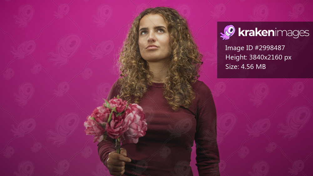 Woman with curly hair holding pink bouquet in hand, wearing maroon top, looks upward and shrugs against magenta studio backdrop; contemplation solitude longing.