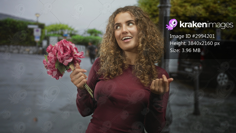 Woman with curly hair holding pink bouquet in left hand and smiling while gesturing open right hand on wet street; joy wonder.