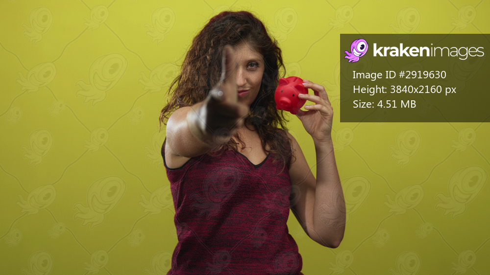 Woman with curly hair holding red piggy bank and finger gun pointing to camera in lime green studio; financial confidence.
