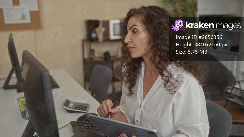 Woman with curly hair holding stylus to tablet on desk in bright office interior; concentration productivity.