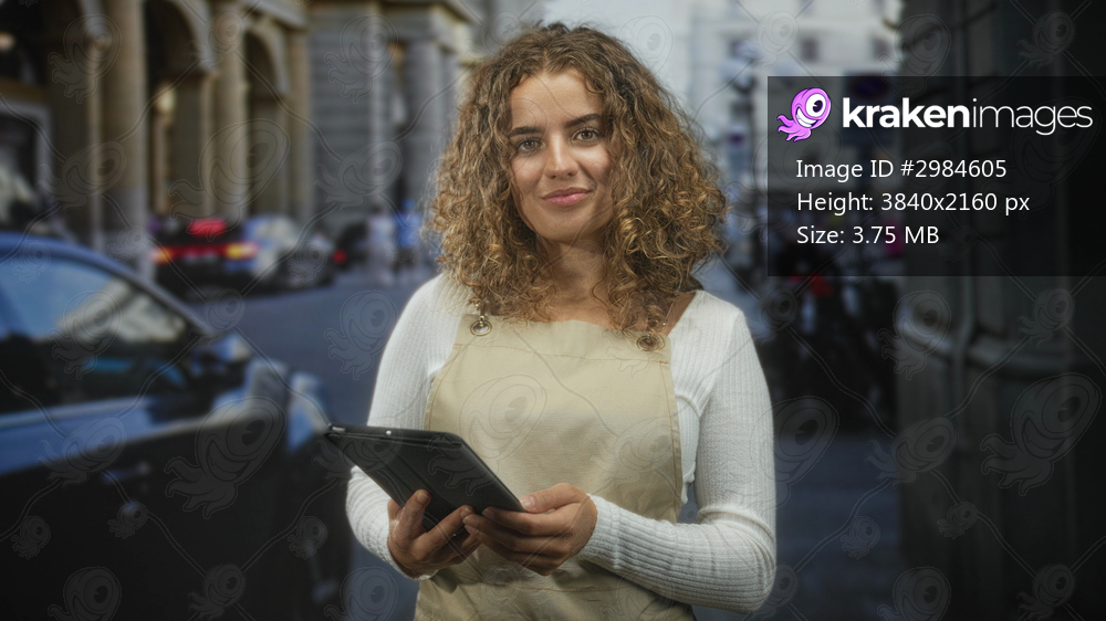 Woman with curly hair holding tablet with hands, wearing beige apron and white sweater, smiling while standing on street near parked car; friendly confidence. - Kraken Images