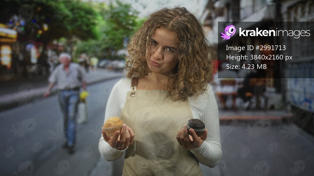 Woman with curly hair holding two muffins in both hands, wearing apron, comparing flavors while making a pensive face on a busy street; uncertainty choice. - Kraken Images
