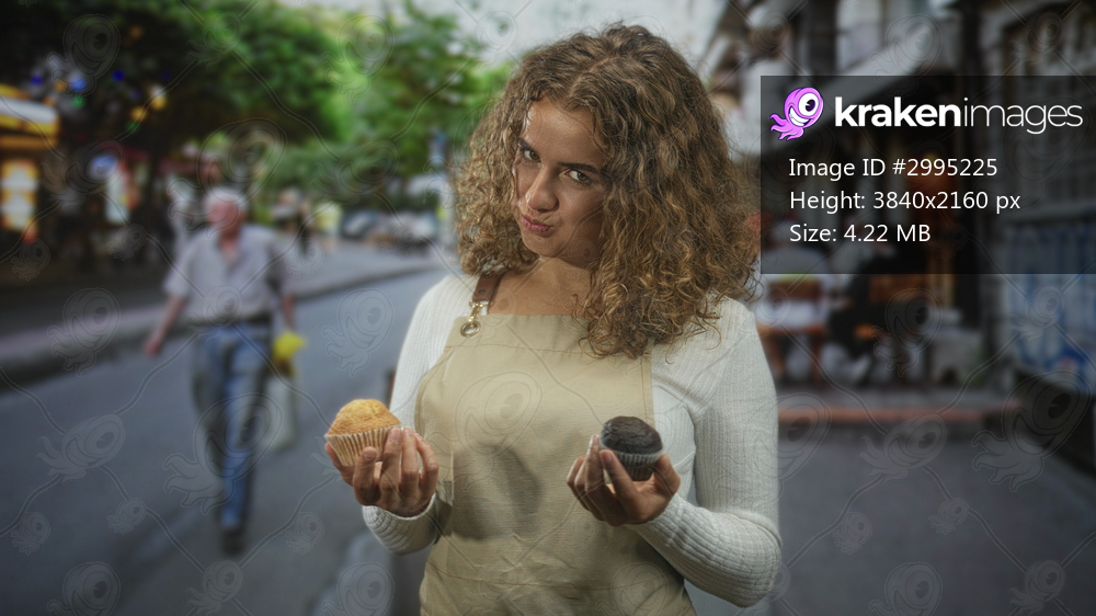 Woman with curly hair holding two muffins in both hands, wearing apron, comparing flavors while making a pensive face on a busy street; uncertainty choice. - Kraken Images