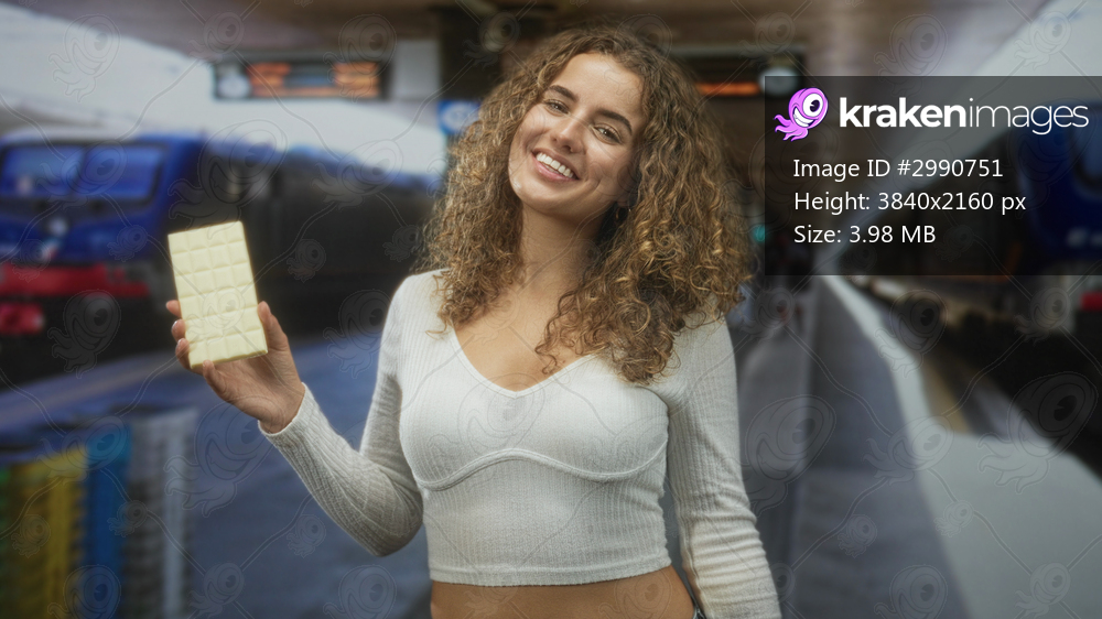 Woman with curly hair holding white chocolate bar on a train platform, wearing cropped white top, smiling and holding the bar in her left hand; joy travel. - Kraken Images