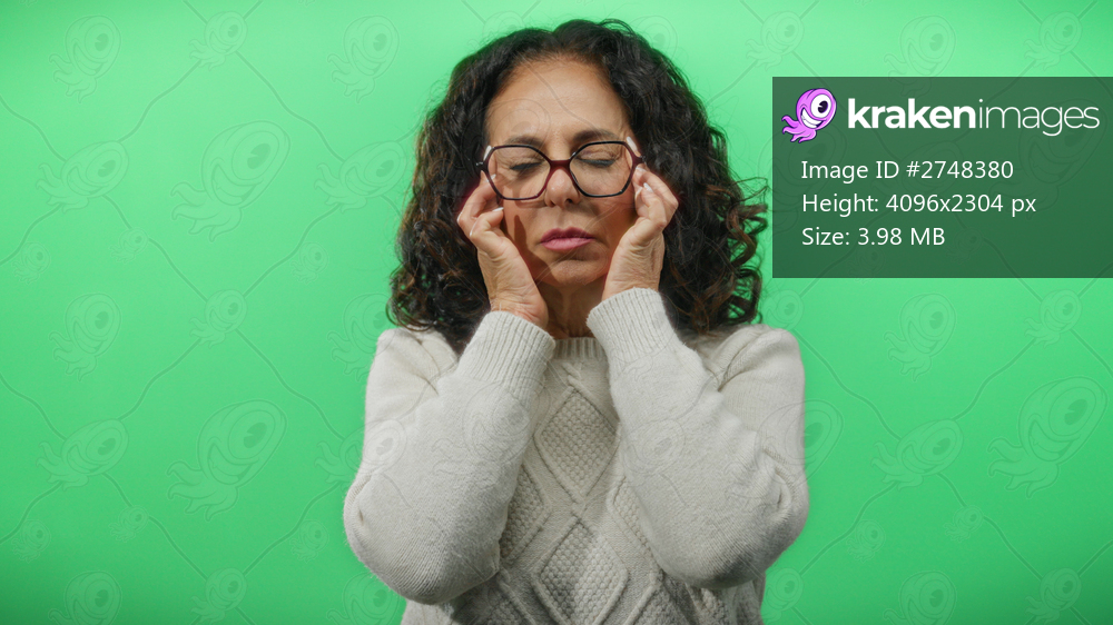 Woman with curly hair holds head in pain against green background, capturing a moment of stress and discomfort. dressed casually, she represents midlife challenges vividly. - Kraken Images
