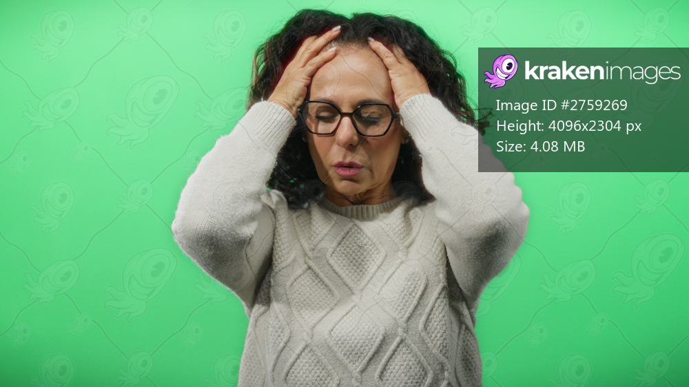 Woman with curly hair holds head in pain against green background, capturing a moment of stress and discomfort. dressed casually, she represents midlife challenges vividly. - Kraken Images