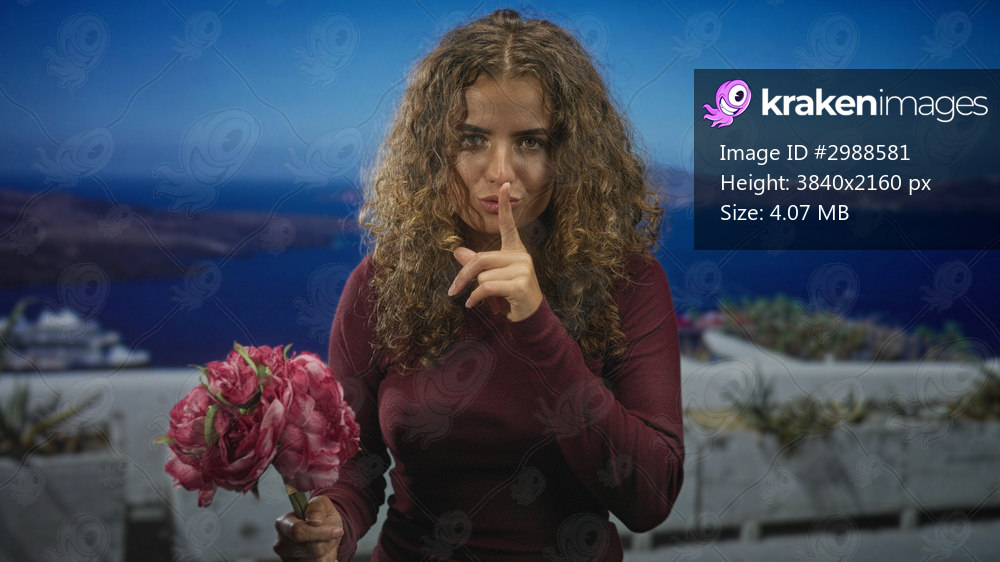 Woman with curly hair holds pink flowers and presses index finger to lips on a building terrace overlooking the sea; silence secrecy.