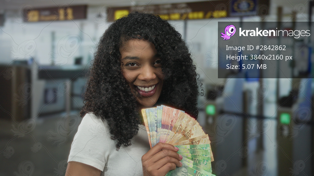 Woman with curly hair holds rand banknotes and smiles broadly in a brightly lit airport terminal; excitement.