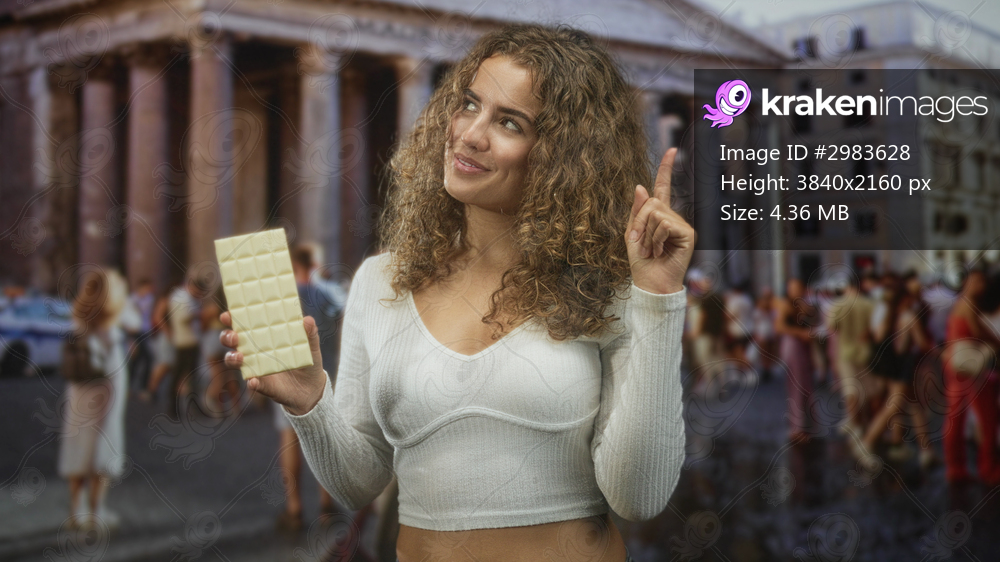 Woman with curly hair holds white chocolate bar, shows bare midriff and points finger upward at a building in a crowded square; cheerful promotion.