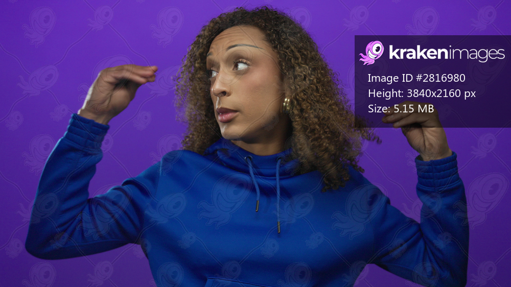 Woman with curly hair in a blue hoodie makes a talking hands gesture in a purple studio setting; doubt.