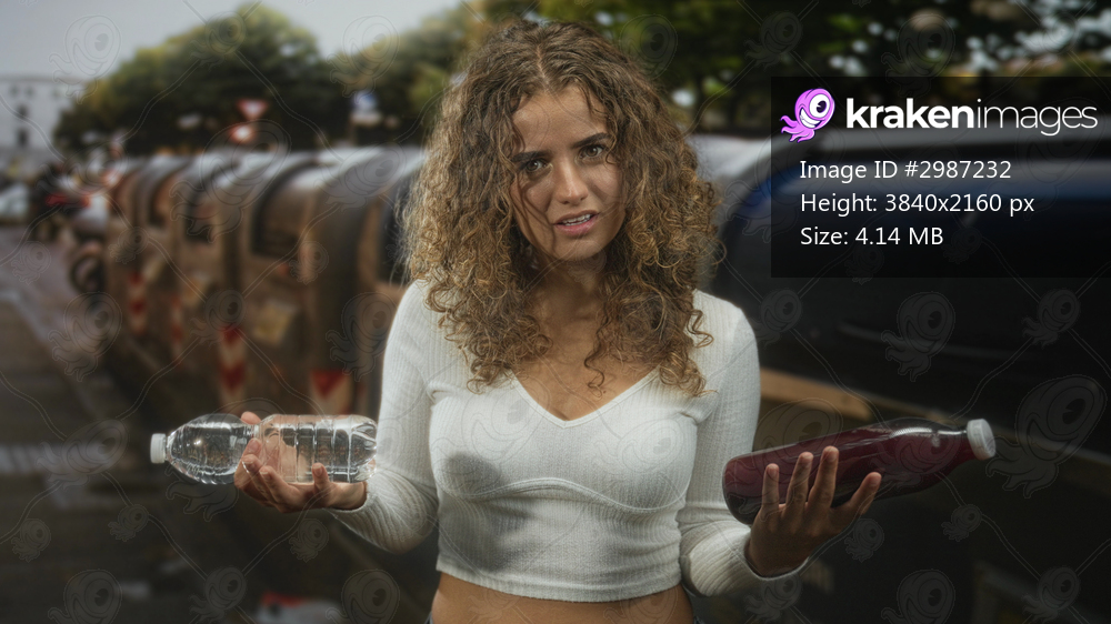 Woman with curly hair in a white cropped top holding a clear water bottle and a dark juice bottle, hands outstretched beside recycling bins on a street; uncertainty choice dilemma. - Kraken Images