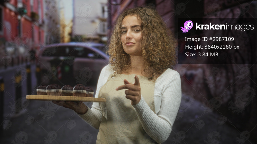 Woman with curly hair in apron holding a tray of muffins and pointing finger on a street; friendly invitation.