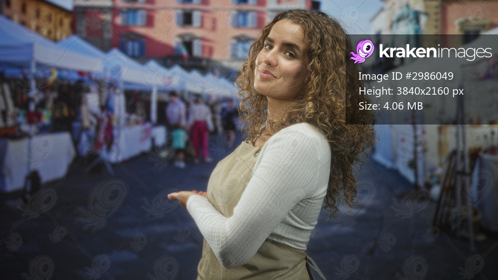 Woman with curly hair in apron holds out right hand palm up presenting at street market stalls; friendly welcome.