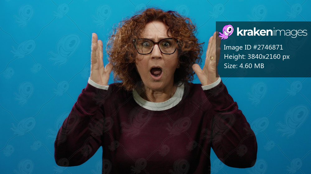 Woman with curly hair in glasses expressing shock with hands raised on blue background with brunette hairstyle wearing maroon sweater showing emotion hispanic middle age female - Kraken Images