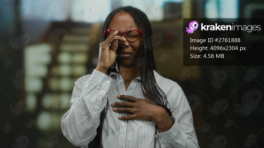 Woman with curly hair in glasses indoors appears unwell, eyes closed in discomfort, hand on chest suggesting illness or fatigue in a dimly lit room.