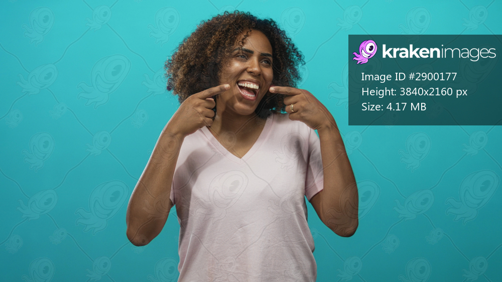 Woman with curly hair in pink t shirt points finger to mouth showing teeth and broad smile in turquoise studio; joy.
