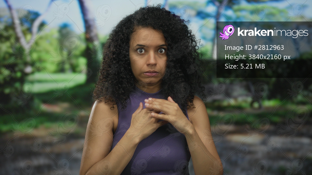 Woman with curly hair in purple top covers mouth with hand in forest clearing under dappled sunlight; surprise.