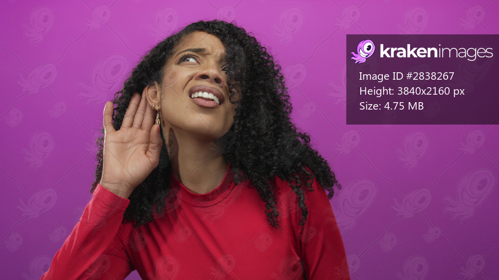 Woman with curly hair in red shirt holds hand to ear in purple studio; curiosity attention listening engagement.