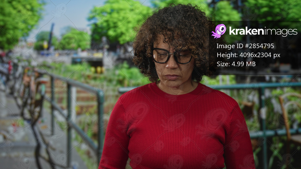 Woman with curly hair in red sweater wearing glasses with hands on hips and frowning face on downtown street; defiance.