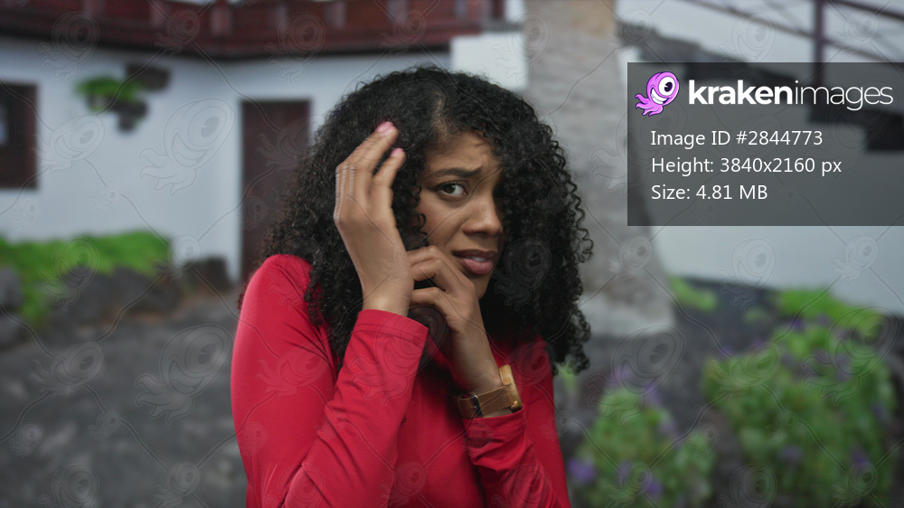 Woman with curly hair in red top mouth open and fists raised at house entrance near stone walkway outdoors; fear.
