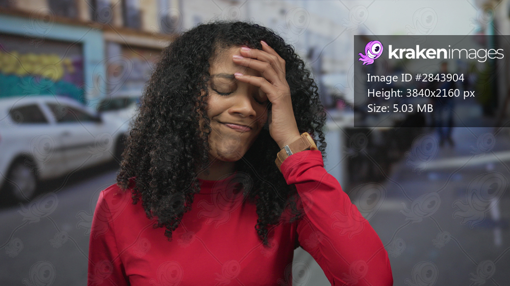 Woman with curly hair in red top touching forehead while looking up at graffiti wall on outdoor street scene; frustration.