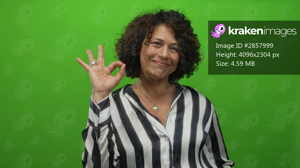 Woman with curly hair in striped shirt making ok sign with raised hand in green studio setting; approval.
