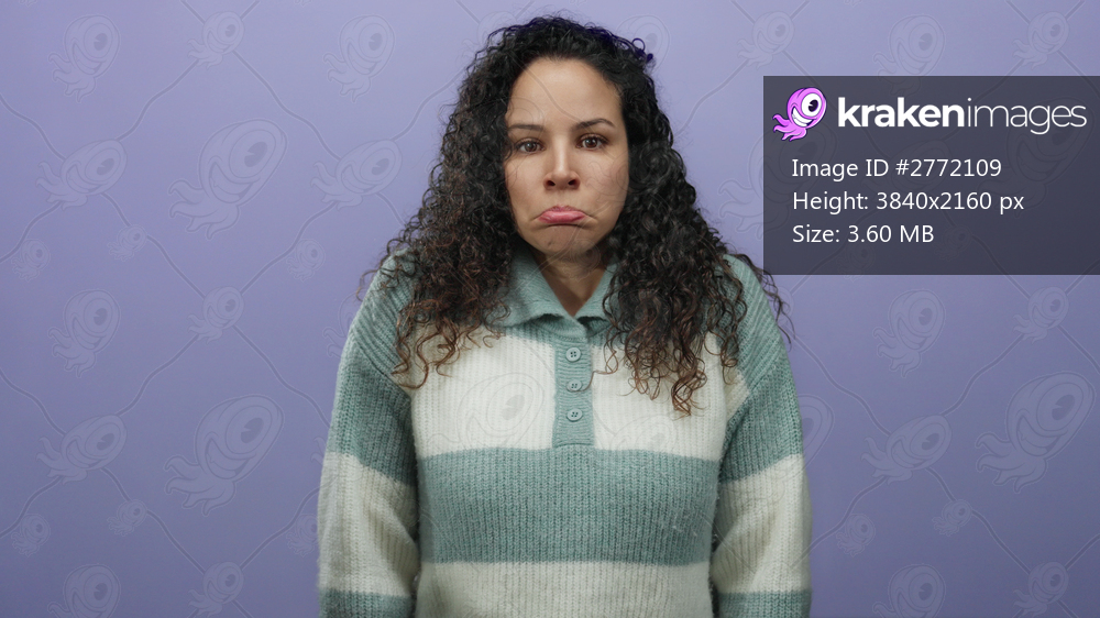 Woman with curly hair in striped sweater appears sad against purple wall expressing melancholic emotion alone in studio setting evoking feelings of solitude and contemplation. - Kraken Images