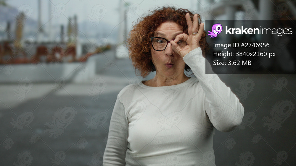 Woman with curly hair in urban street making playful gesture with hand by eye, wearing glasses and white sweater.