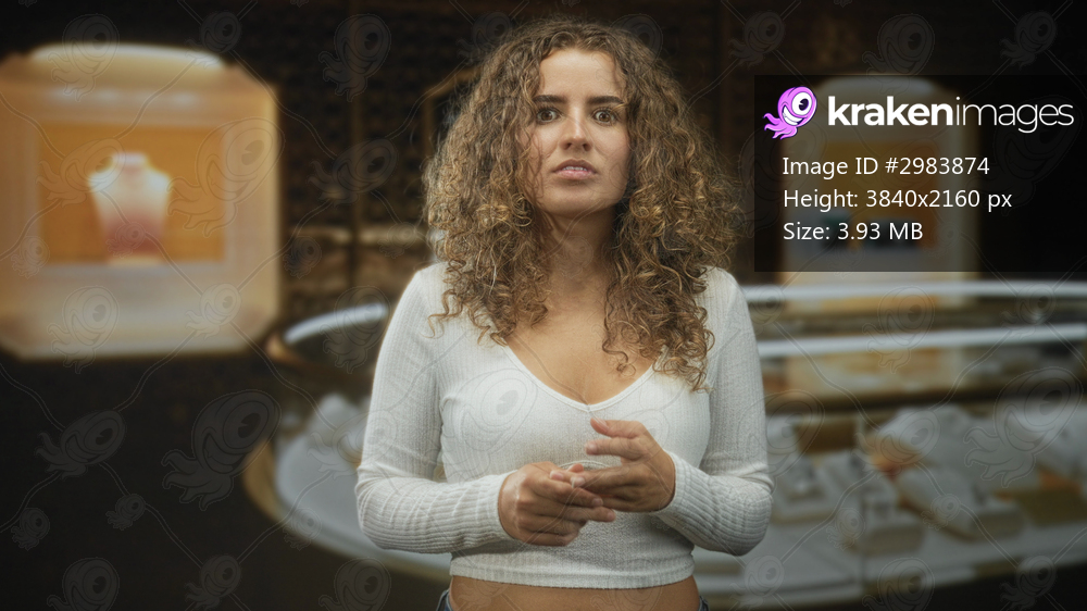 Woman with curly hair in white cropped top palms up shrug by jewelry display case and mannequin in a store building; confusion.