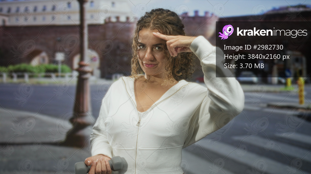 Woman with curly hair in white hoodie holding a small dumbbell and pointing finger to temple while smiling on a street with brick archway; confident fitness focus. - Kraken Images